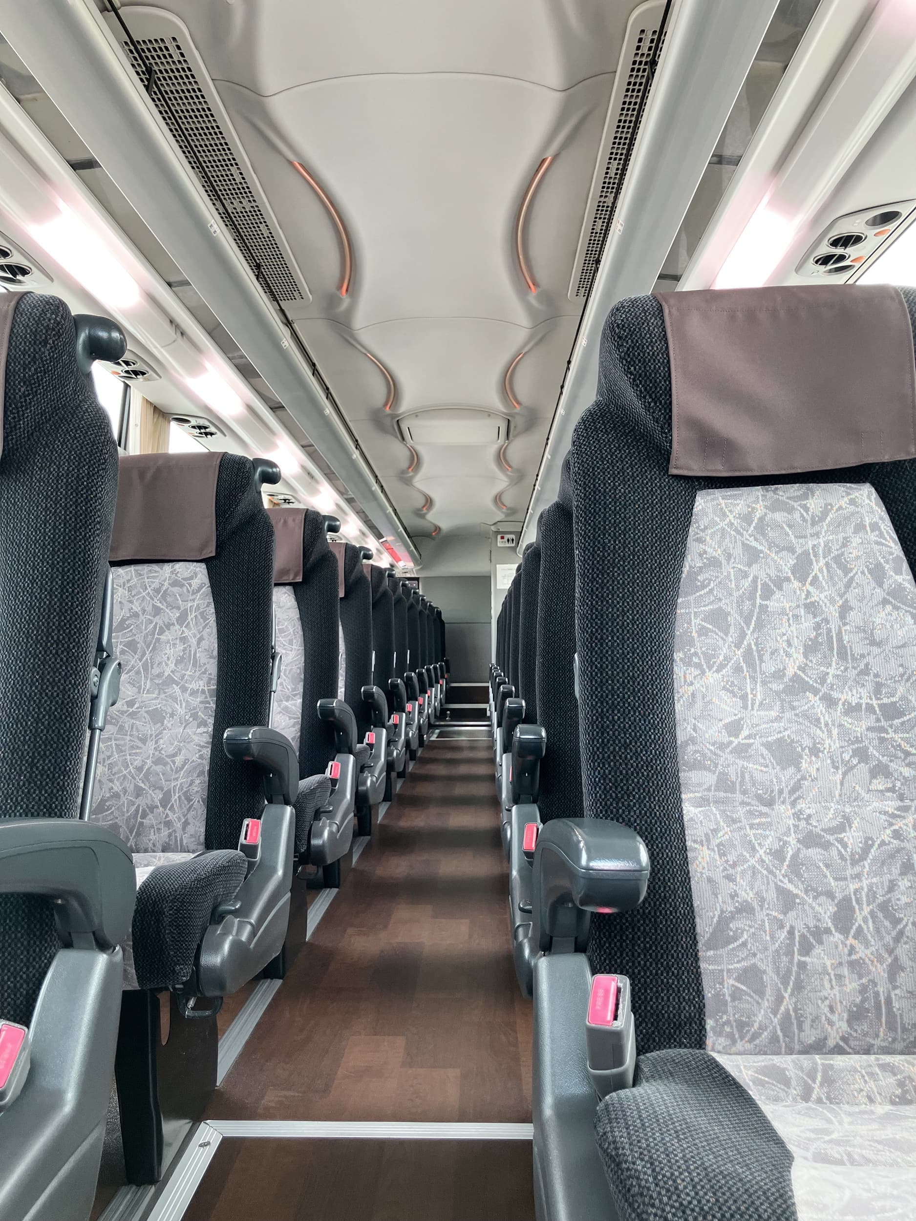33名乗りの中型バスは、大型バスと同等の充実した設備と乗り心地を備えており、座席間隔が広くゆったりとしています。